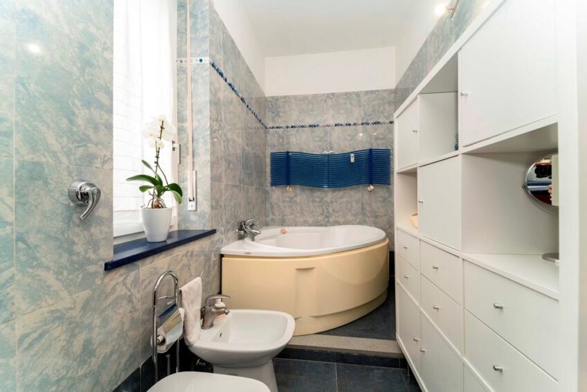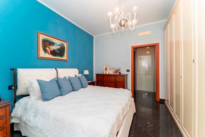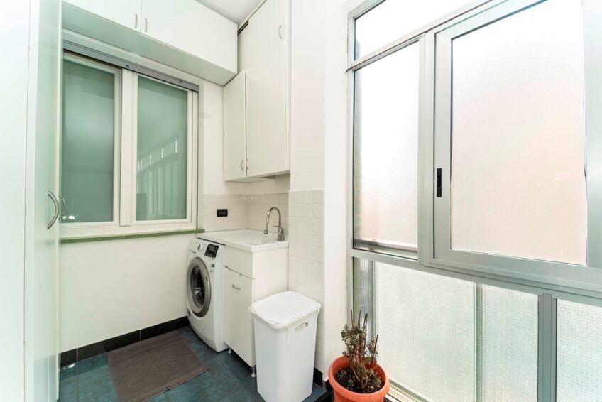 Completano la soluzione i 2 bagni, uno con vasca idromassaggio, la predisposizione del climatizzatore, la cabina armadi, 3 termoarredo e zona lavanderia con armadiature.