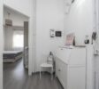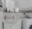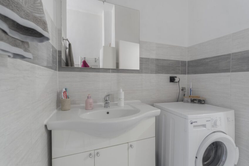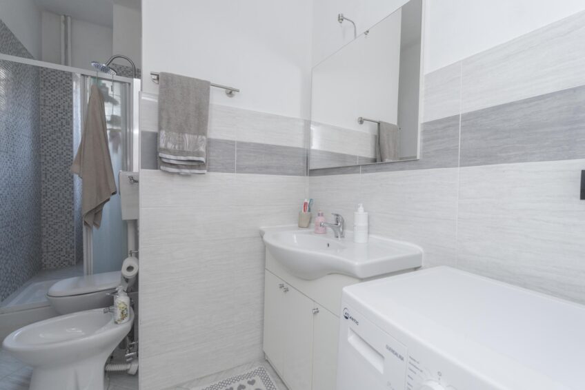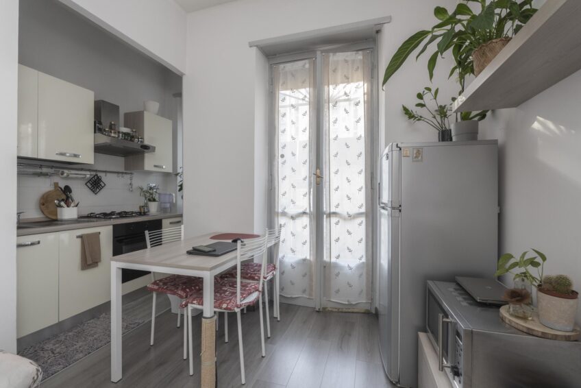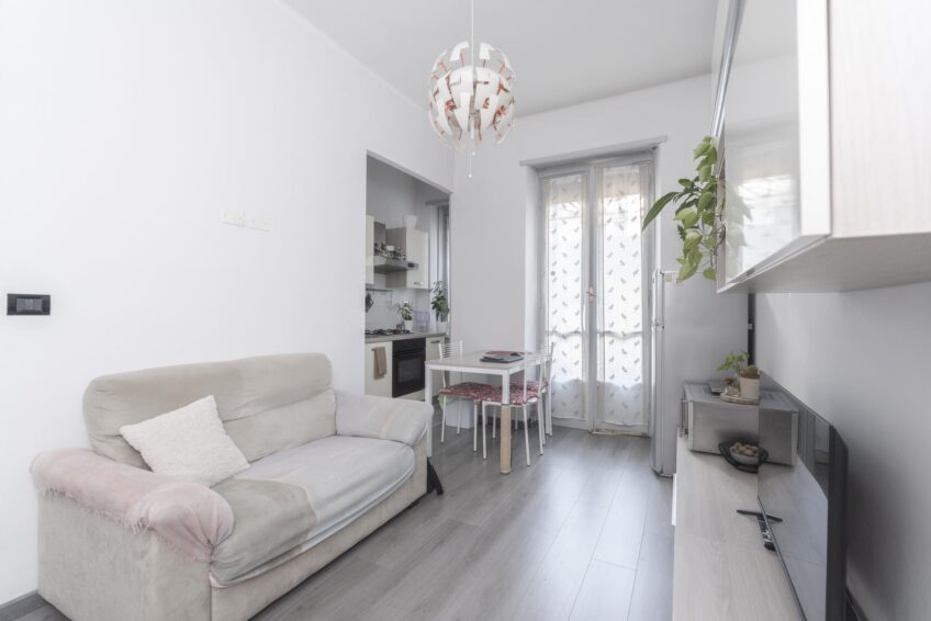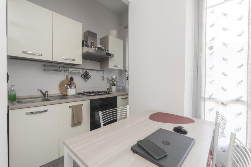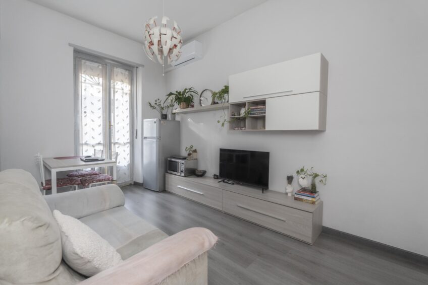 COMPLETO DI MOBILI come da foto: camera completa, mobile soggiorno, divano 2 posti, tavolo con sedie, mobile ingresso, cucina lineare con elettrodomestici, frigo, lavatrice e mobile bagno con specchiera.