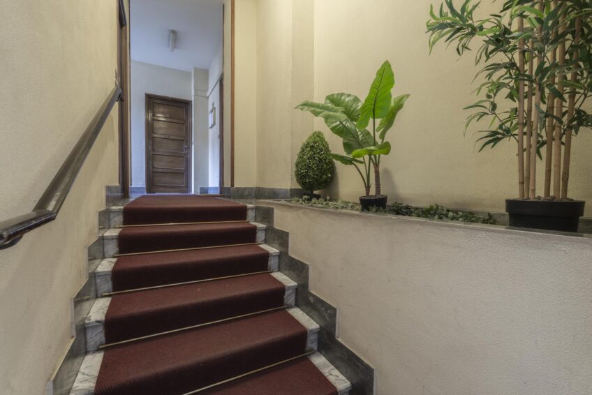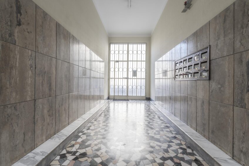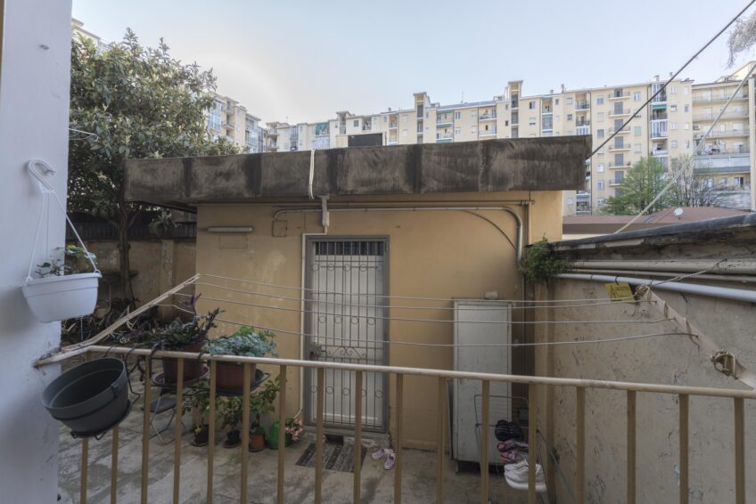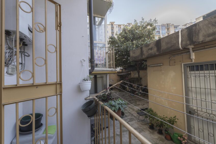 Piccolo balcone con affaccio sull’ interno del cortile condominiale con grate antintrusione.