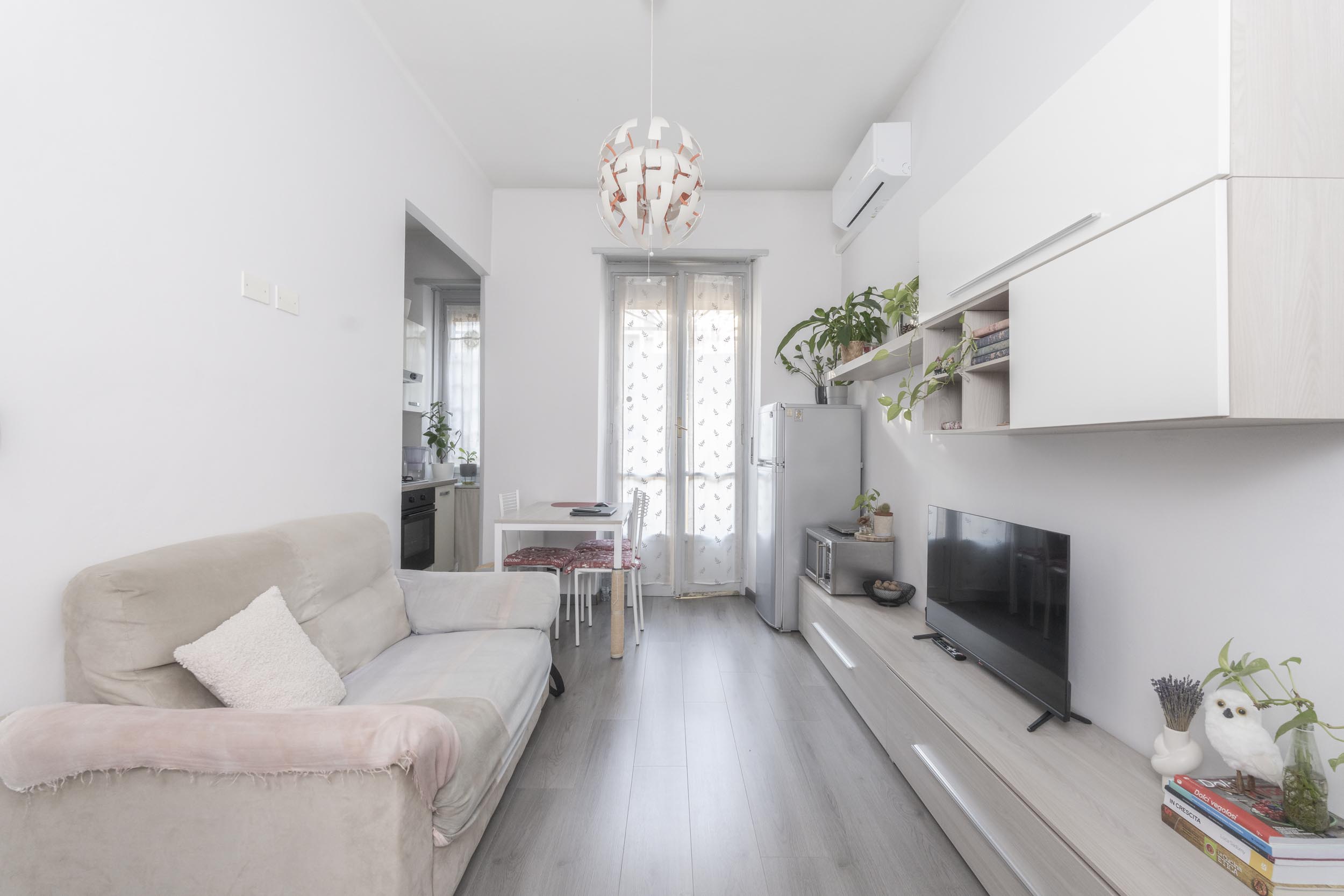 COMPLETO DI MOBILI come da foto: camera completa, mobile soggiorno, divano 2 posti, tavolo con sedie, mobile ingresso, cucina lineare con elettrodomestici, frigo, lavatrice e mobile bagno con specchiera.