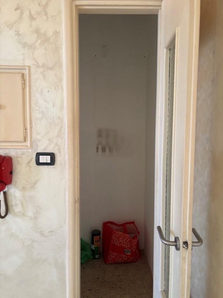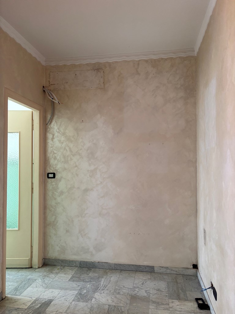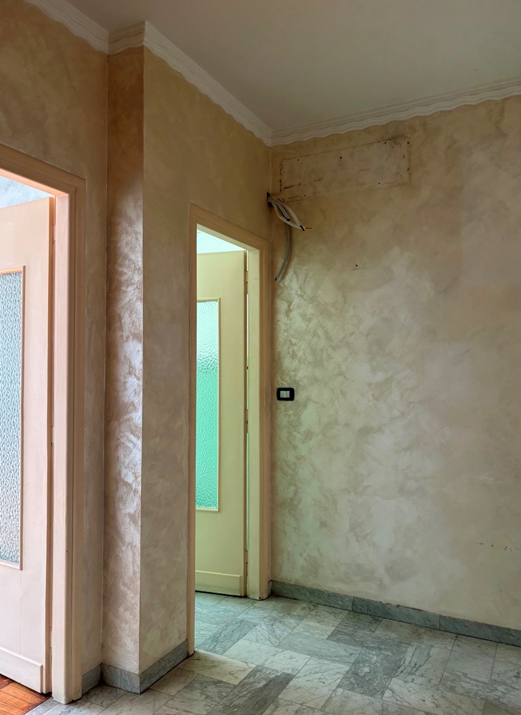 Presenta pavimenti in parquet in camera da letto, marmo in ingresso e graniglia nel tinello e cucinino, gres porcellanato in bagno. Infissi in stato originale.